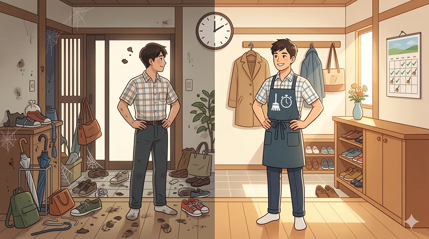 具体的には、靴箱周りのちょっとしたごみ捨てや、簡単な拭き掃除、そして脱いだ靴を定位置に戻すといった、本当にささやかな作業の繰り返しなんです。